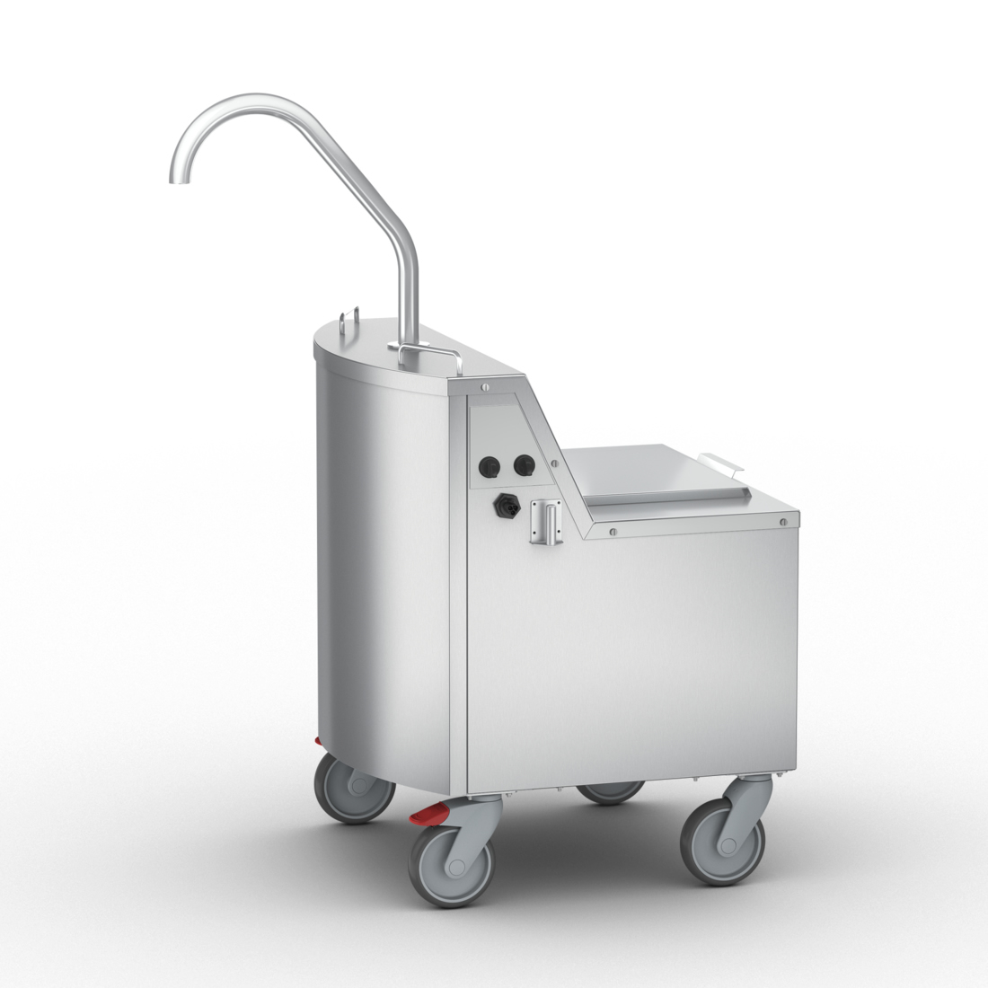 Der Ölwagen ist die optimale Ergänzung beim Frittieren. Er hat ein Fassungsvermögen von 49 Litern, pumpt das Öl direkt in den Tiegel und kann auch Blockfett schmelzen.